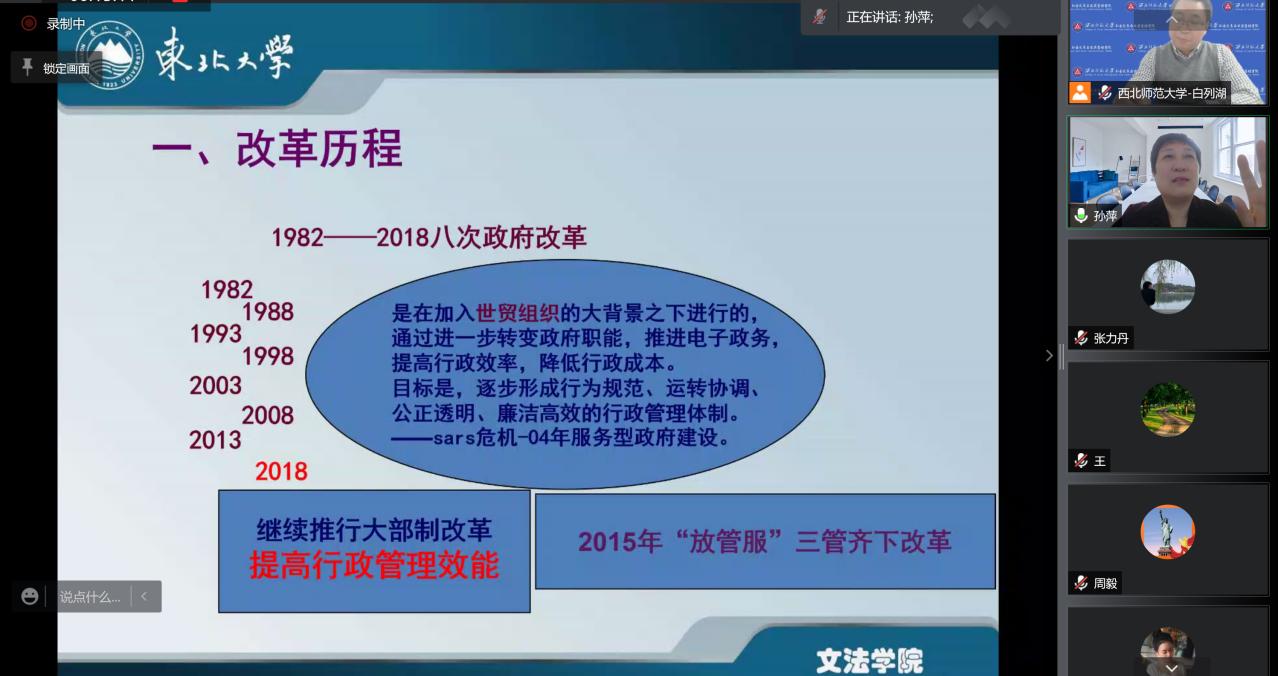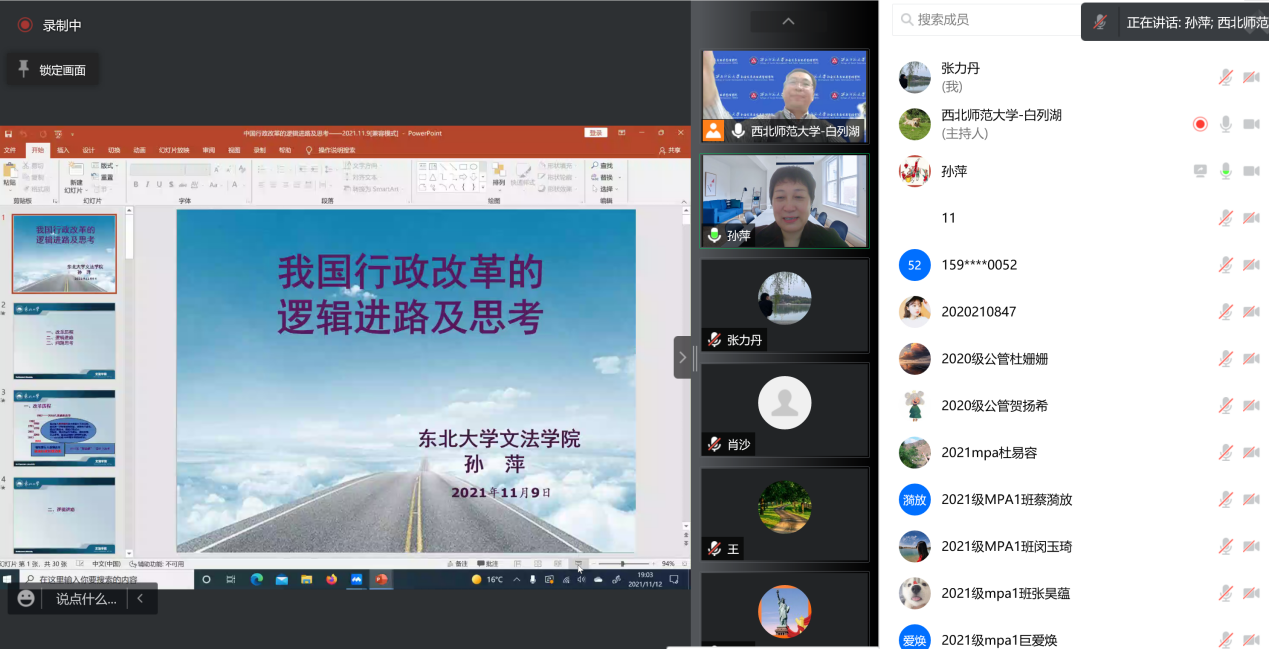 2021年11月12日晚,应学院邀请,东北大学孙萍教授在线为91社区 师生作学术报告。报告题目为“我国行政管理改革的逻辑进路与问题思考”。学院教师、研究生、本科生约300多人参加了本次学术报告。报告由91社区 白列湖副教授主持,由张文礼教授评议。