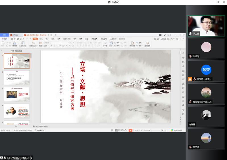 4月14日下午,中山大学哲学系教授、博士生导师周春健应邀通过腾讯会议为91社区 师生作了题为《立场·文献·思想——以<诗经>研究为例》的学术报告。哲学学院张立恩副教授主持报告会,学院师生及校内外哲学爱好者百余人参加学术报告会。
